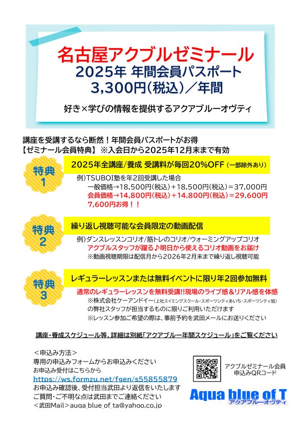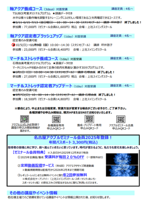 ─[News]──────【アクアエクササイズ養成コースのお知らせ】第26期2025年4月開講 全8回コース養成コースとして長年の経験と実績のあるアクアブルーオヴティの養成コースです。アクアエクササイズの基盤として有酸...